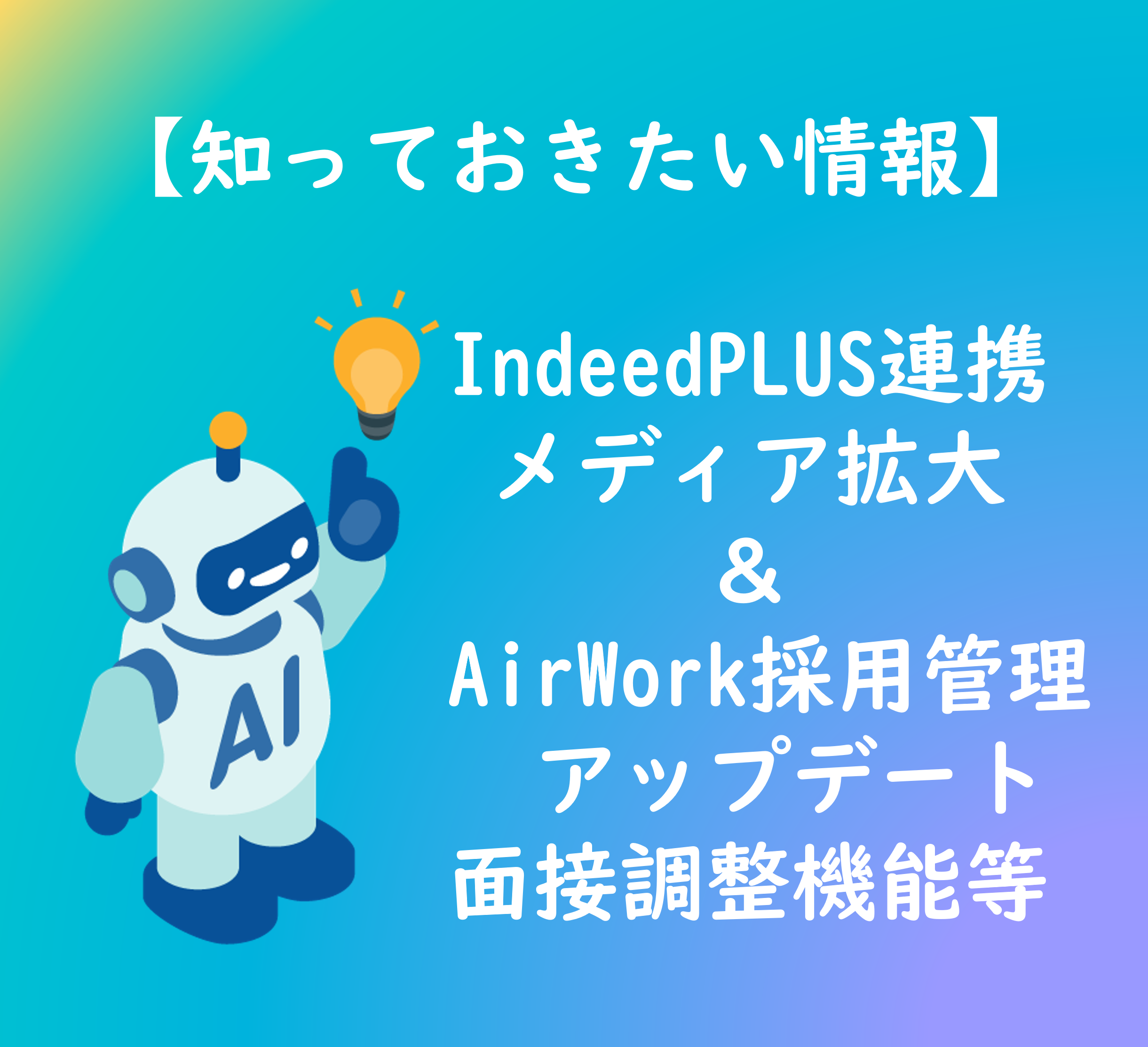 IndeedPLUSの連携メディアのアップデート情報と、採用活動を行う企業様でご利用率の高い「Airワーク採用管理」のアップデート情報。